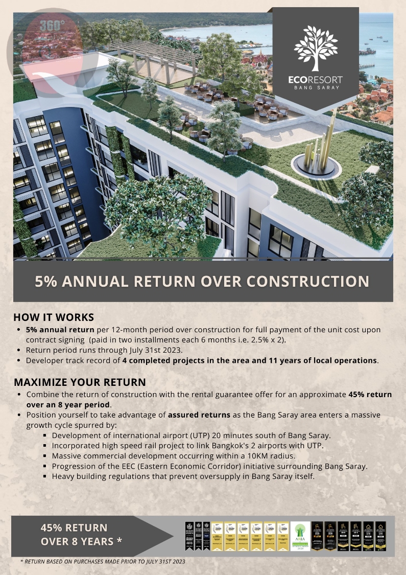 ECO Resort is ontworpen als een toevluchtsoord in het hart van Bang Saray. Dit featurerijke project heeft alle voordelen van een serviceresidentie met tal van faciliteiten en diensten die u een hoogwaardige leefomgeving bieden. ECO Design doet een beroep op het moderne bewustzijn en creëert een positieve impact op het milieu terwijl er geld wordt bespaard op de stijgende energiekosten.